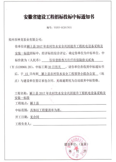 祝贺我司在安徽省农村饮水工程中标513万余元