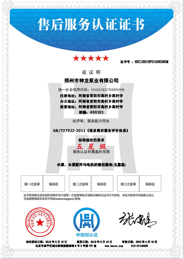 祝贺郑州市神龙泵业有限公司获得水泵、水泵配件与电机的五星级售后服务认证。