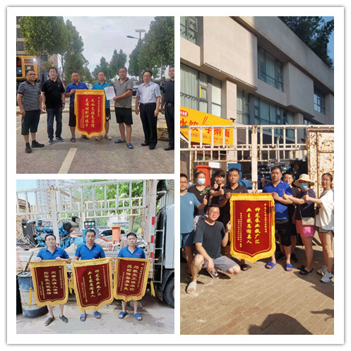 郑州市神龙泵业有限公司自7月21日以来,在郑州各个小区组织地下室排水工作24小时不间断轮班制的深水里进行排水作业,各被救援小区居民争相制作锦旗感谢神龙排涝突击队。